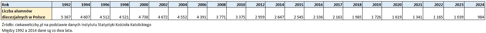W 1992 r. w seminariach duchownych było 5 367 alumnów diecezjalnych, podczas gdy w 2024 r. – zaledwie 984.